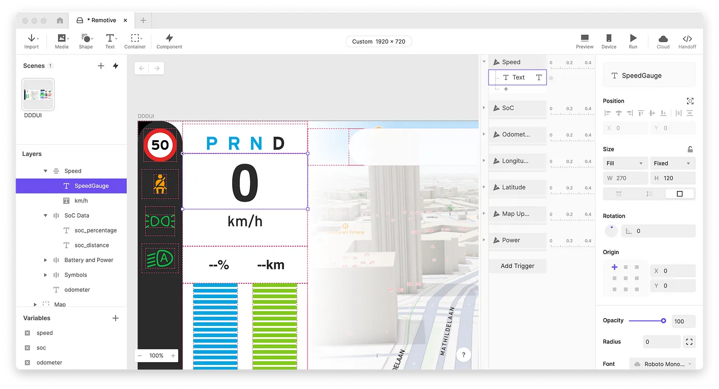 Once we have the prototype set up in Protopie, we’ll make a connection with RemotiveLabs’ toolset and drive various objects in our UI with streams of vehicle data.